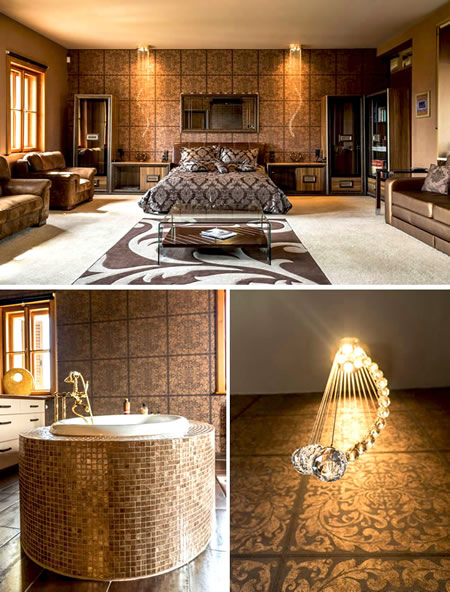 A háló, és élettérhez közvetlenül kapcsolódik a nagyméretű gardróbhelység, középen szabadon álló, kétoldalas, épített ovális káddal.