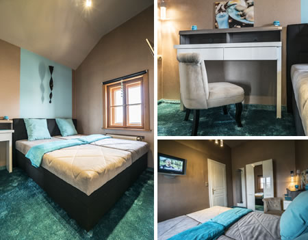 A második emeleten található Türkiz szoba egy letisztult, meghitt, puha fészek boxspring ággyal, TV-vel, légkondicionálóval és bluetooth-os hangsugárzóval.