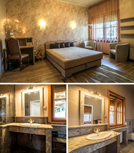 Saját gránitburkolatú fürdőszobájában kényelmes mosdópult és nagyméretű üveg tusolókabin található. Wc-vel és bidével felszerelt. A szobában TV, légkondicionáló és bluetooth-os hangsugárzó található.