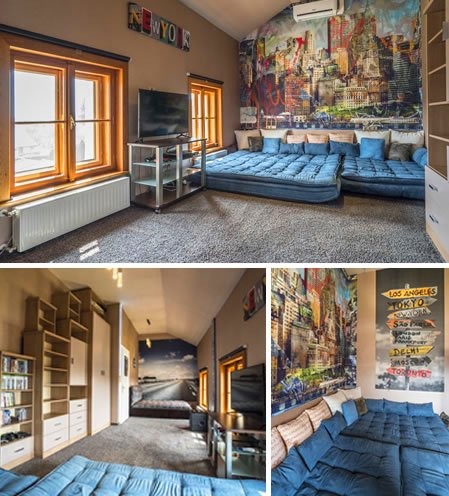 A második emeleti Graffiti szobát a jellegzetes design, illetve a felszereltsége miatt ajánljuk „örök fiatal” pároknak, továbbá gyermekek vagy fiatalok „főhadiszállásának”, hiszen 4K-s smart Tv, PlayStation 4, XBoxOne konzolok és játékok állnak rendelkezésre.